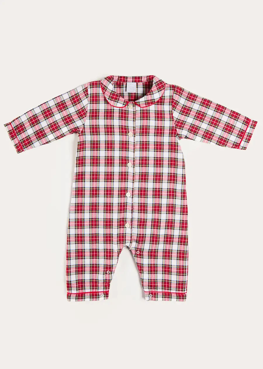 The Francis Tartan Long Sleeve All-In-One Pyjama in Red is a charming seasonal sleepwear piece crafted in our bespoke red Francis Tartan, new for the season. Featuring a sweet Peter Pan collar, long sleeves, and smart button detailing down the front, it's both classic and comfortable. Practical poppers at the legs ensure easy dressing and changing, making it the perfect choice for cosy winter nights and festive mornings.