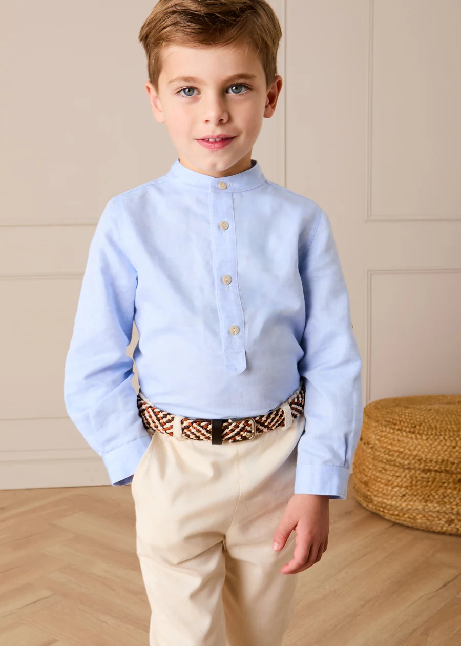 This blue linen-cotton shirt combines natural materials for a soft, breathable feel. The Mao collar adds a modern twist to the classic design, while the long sleeves offer versatility for layering or cooler days. Crafted from a blend of 70% cotton and 30% linen, it provides a comfortable and lightweight fit. Perfect for both casual and more polished looks, this shirt is a timeless addition to your little one's wardrobe.
