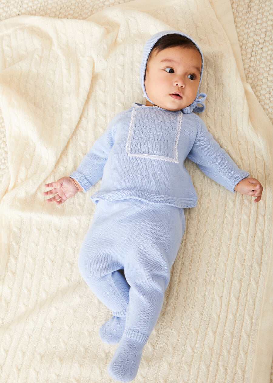 Crafted from gentle, high-quality knit fabric in a soothing shade of blue, this two-piece set is designed to cocoon your newborn in cozy comfort. The softness of the knit provides a gentle touch against delicate skin, ensuring that your baby feels snug and secure. It has a delicate lace trim and statement ruffle collar.