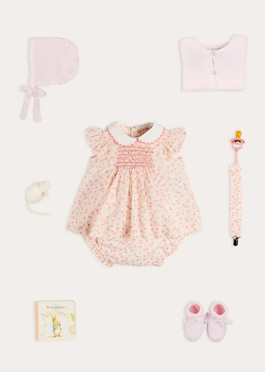 The Martha Floral Hand Smocked Cap Sleeve Scallop Collar Dress in Pink is a delicate and timeless ensemble for little girls, crafted with Pepa London’s signature attention to detail. Made from soft, high-quality cotton in a bespoke Martha floral print, it features hand-smocked detailing across the front, a scallop-edged Peter Pan collar in crisp white, and cap frill sleeves for a refined finish. The set is completed with matching bloomers, making this luxury baby dress a perfect blend of comfort, charm, and sophistication.