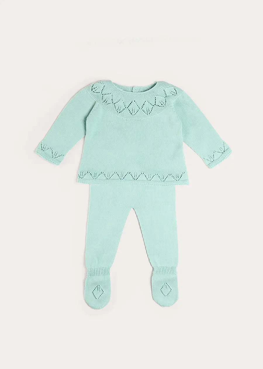 The Diamond Openwork Three Piece Knitted Set in Sage Green is a quintessentially refined outfit for newborns, crafted from 100% soft cotton for gentle comfort against delicate skin. This luxurious set features a diamond openwork design and includes a top, bottoms with attached feet, and a coordinating bonnet, creating a cohesive and elegant ensemble. Perfect for layering or as a standalone outfit, it embodies Pepa London’s signature craftsmanship and timeless charm, making it an ideal choice for special occasions or everyday refinement.
