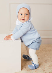 Halten Sie die Kleinsten in dieser blauen Strickjacke warm. Es besteht zu 100 % aus Wolle und verfügt über aufwendige, durchbrochene Details symmetrisch entlang der Oberseite sowie zwei obere Knöpfe, die geschlossen oder geschlossen getragen werden können.