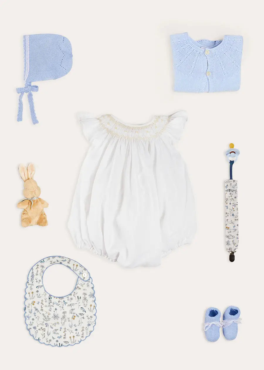 This classic white hand smocked romper, made from 100% soft cotton, is the perfect choice for your newborn. With its delicate hand-smocked detailing and sleeveless design, this romper offers both comfort and elegance. The timeless simplicity of white makes it an ideal piece for any occasion, from precious moments at home to special outings, while its soft cotton fabric ensures a gentle touch on delicate skin. A lovely, understated piece for your baby’s early days.