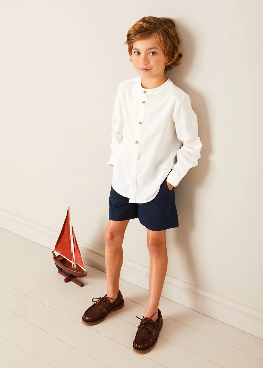 A smart style to dress your little boy in the summer months. These Classic Navy Shorts are made with 100% breathable cotton. They feature an elasticated waistband for complete comfort and convenient belt loops. They have a small coconut button to fasten at the front and include a back pocket with a small button for a finishing touch.