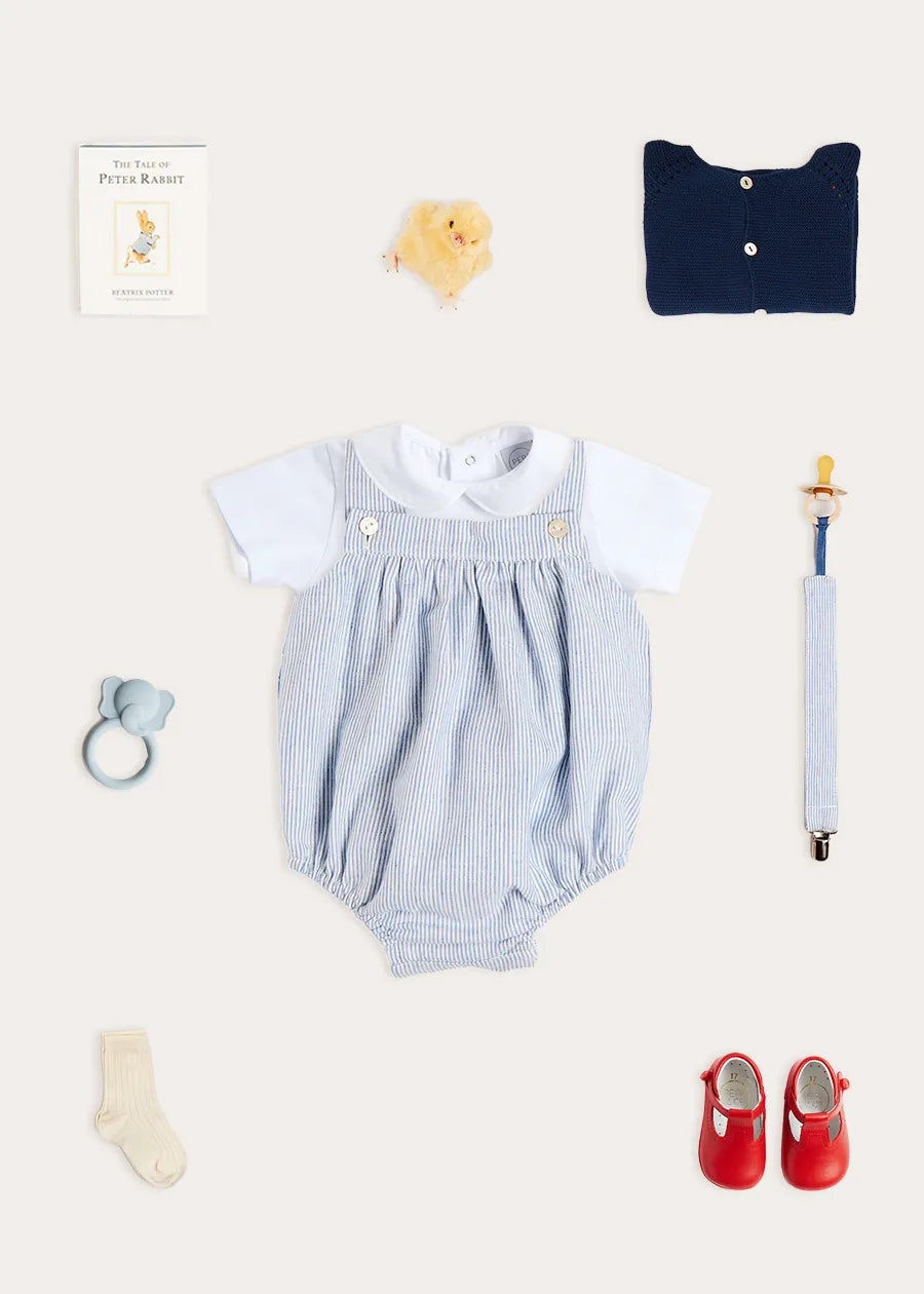 The Alexander Stripe Dummy Clip in Blue is a delicate and practical accessory, crafted from Pepa London’s bespoke Alexander stripe fabric. Featuring a secure metal clip to attach to clothing and a matching ribbon to hold a dummy, it combines functionality with timeless elegance. A luxury finishing touch for little ones, it perfectly complements the Alexander Stripe collection.