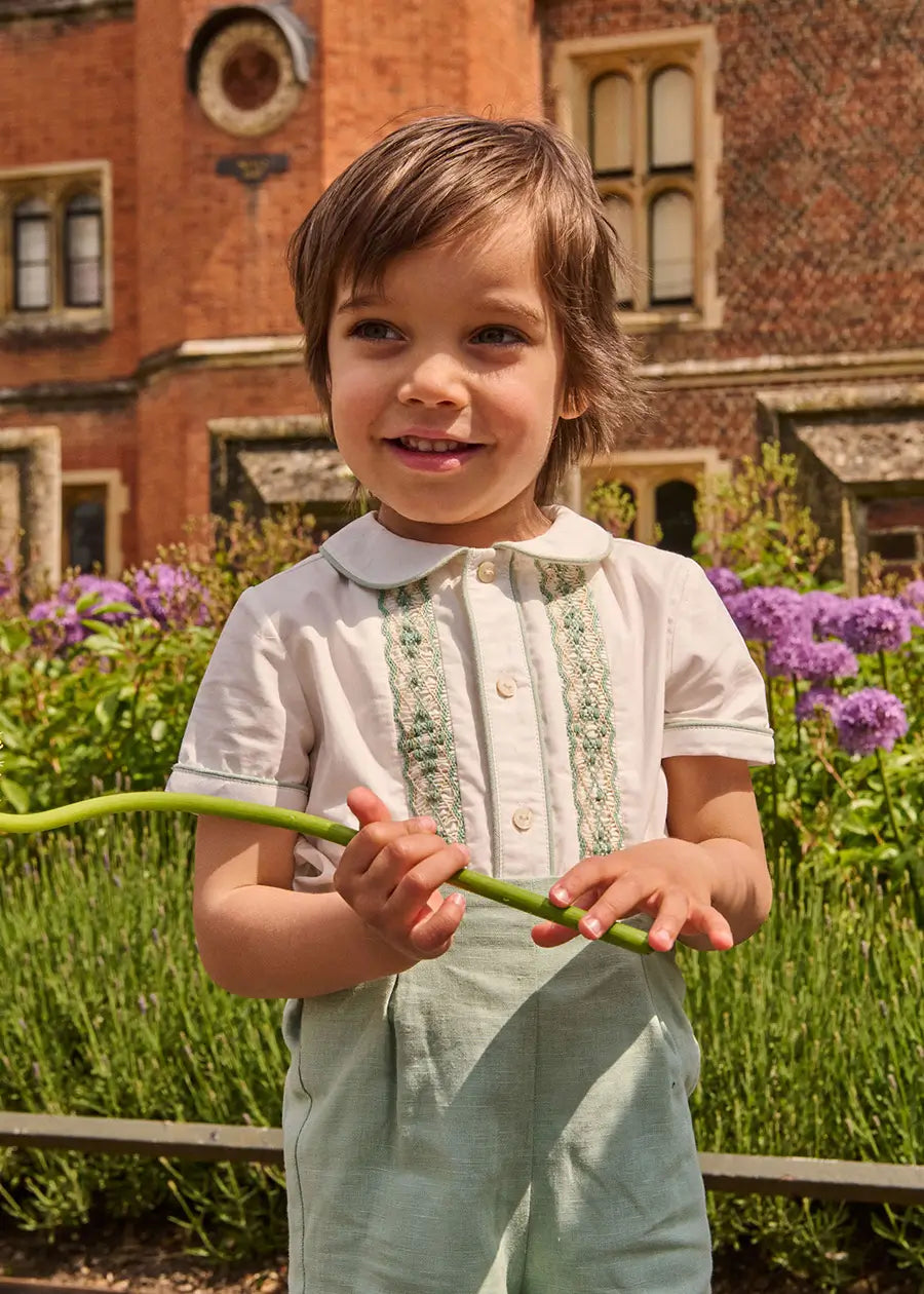 The crisp white shirt showcases exquisite hand smocking down the center front panels, complemented by regency green piping along the button placket, sleeves, and Peter Pan collar for a polished finish. A subtle gold hand-embroidered crown on the waistband adds a distinguished touch, celebrating the collection’s royal inspiration.