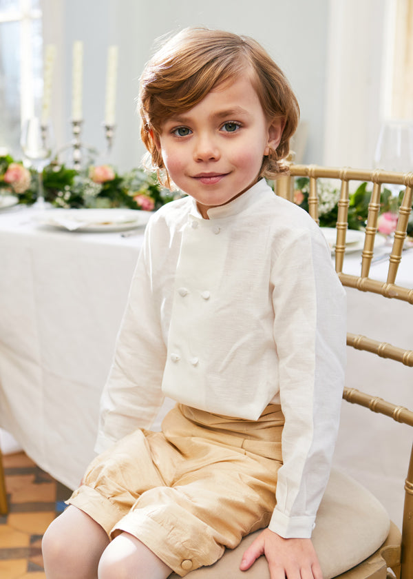 Boy's occasion shirt made from soft mix of linen and cotton. It features a Mandarin collar and fastens at the front with four rows of elegant covered buttons. The traditional cuffs finish the garment by providing a nice shape to the long sleeves. Will look especially smart worn in a traditional heritage style and combined with our celebration silk knickerbockers. For a matching shirt and pants outfit, additional covered buttons are available separately.