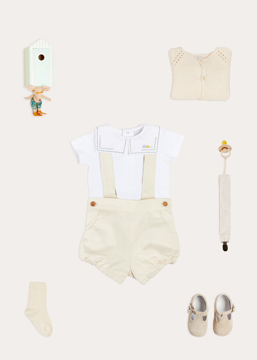 The White Bloomer with Braces combines timeless style and comfort for your newborn or baby boy. Featuring classic braces for a charming touch, these bloomers are perfect for special occasions or everyday wear. Soft and breathable, they pair beautifully with Pepa London’s signature pieces.