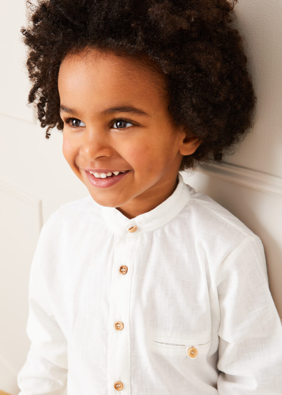 Designed with 100% linen, this White Mao Collar Shirt is a perfect piece to dress your little boy in during the summer months. It has a box pleat detail and a smart Mao collar. The long sleeves can be rolled up and fastening with a small coconut button. It has four coconut buttons down the front that can be undone.