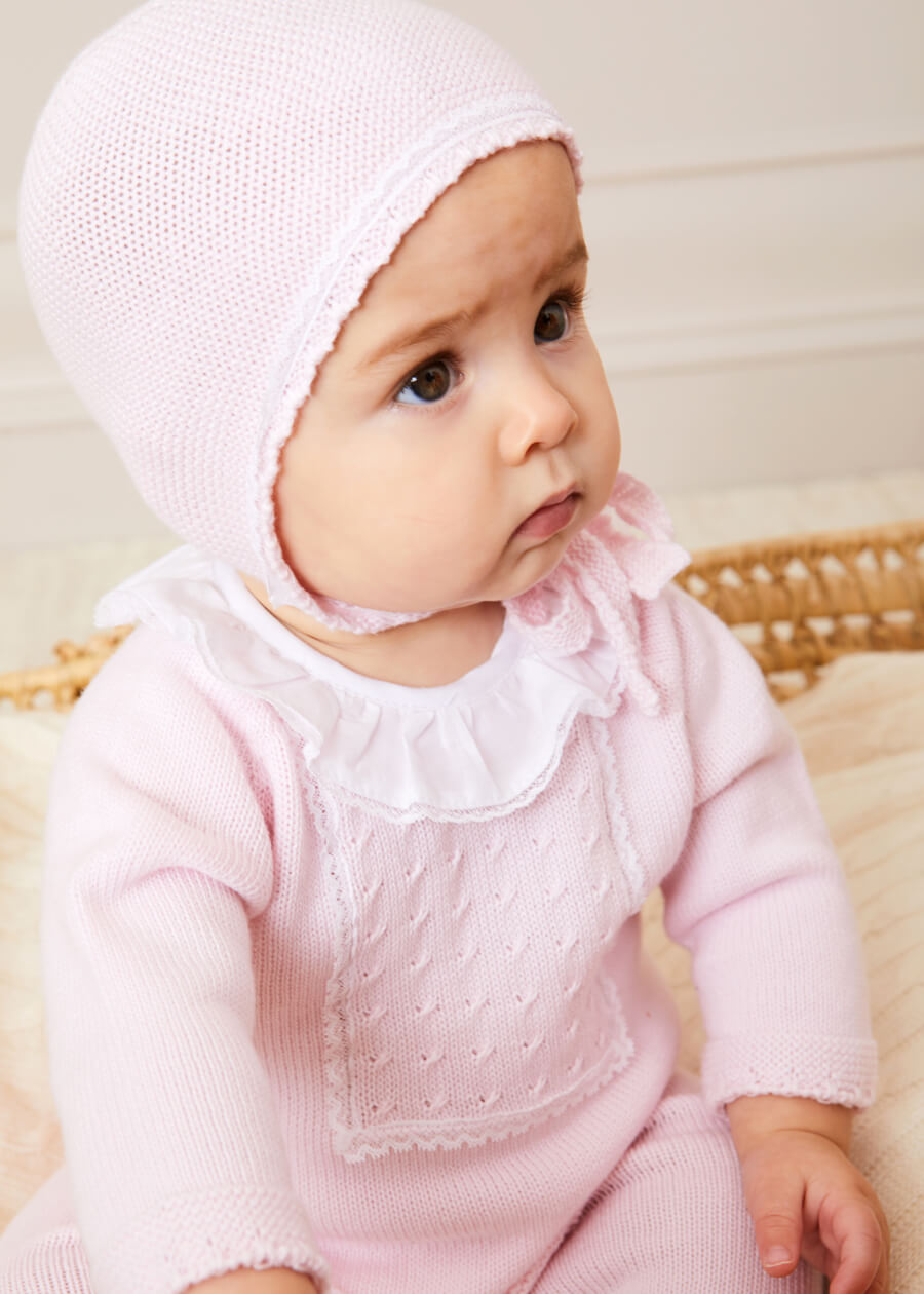 Crafted from gentle, high-quality knit fabric in a soothing shade of pink, this two-piece set is designed to cocoon your newborn in cosy comfort. The softness of the knit provides a gentle touch against delicate skin, ensuring that your baby feels snug and secure. It has a delicate lace trim and statement ruffle collar.