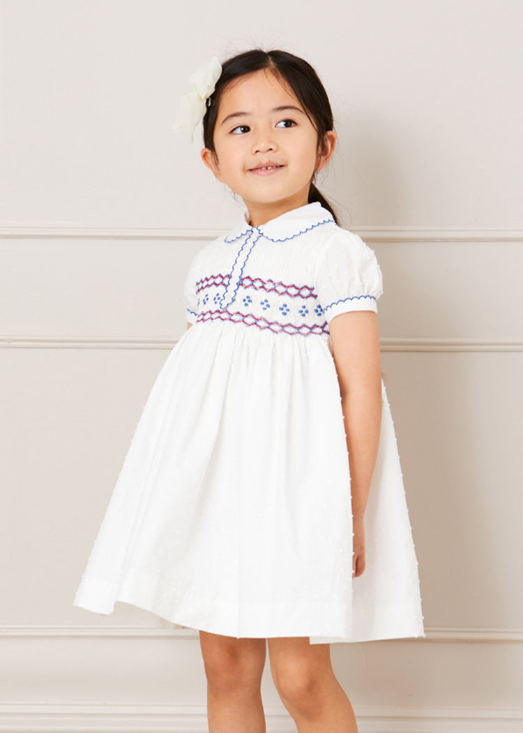 A vision of simplicity and elegance that embodies the grace of childhood, this hand smocked Short Sleeve Dress is designed into a classic silhouette with short sleeves, made perfect to dress up or down.