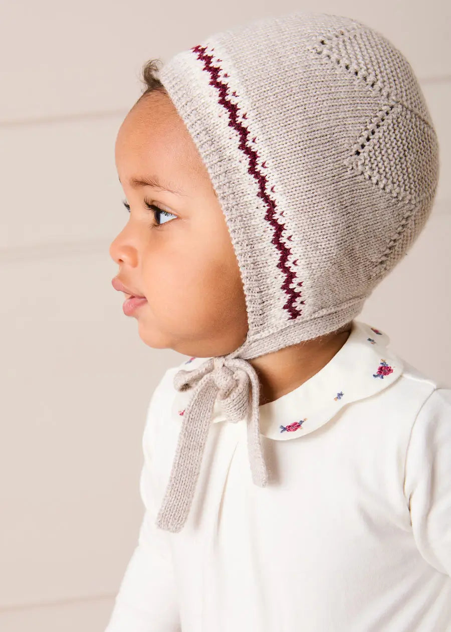 Introducing our Rocking Horse Knitted Bonnet in Beige, meticulously crafted with Fair Isle detailing. This charming bonnet combines timeless style with cozy comfort, perfect for keeping your little one warm during chilly days. The knitted fabric ensures softness and durability, while the Fair Isle design adds a touch of classic elegance. Ideal for both everyday wear and special occasions, this bonnet is a delightful addition to your newborn's wardrobe.